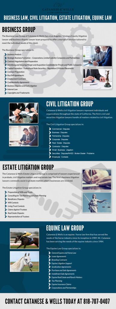 Below is an infographic highlighting Catanese & Wells’ four main areas of focus, including business law, civil litigation, estate litigation, and equine law. Contact us today for more information at 818-707-0407.